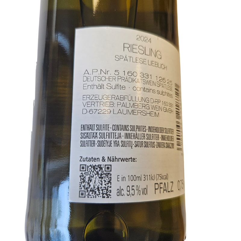 Palmberg Riesling Spätlese Lieblich er blød og sødlig med en behagelig balance mellem sødme og syre.